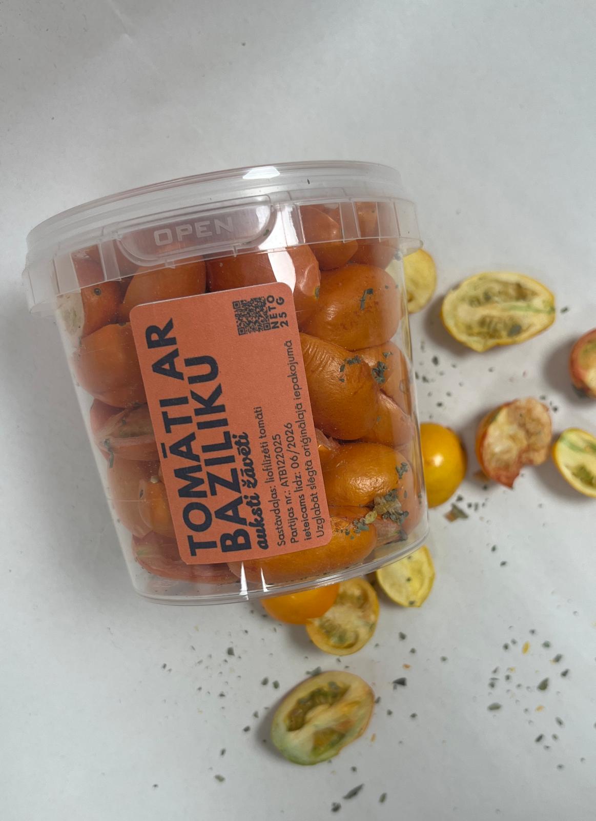 | Sastāvs | liofilizēti tomāti 95%, baziliks 5% |